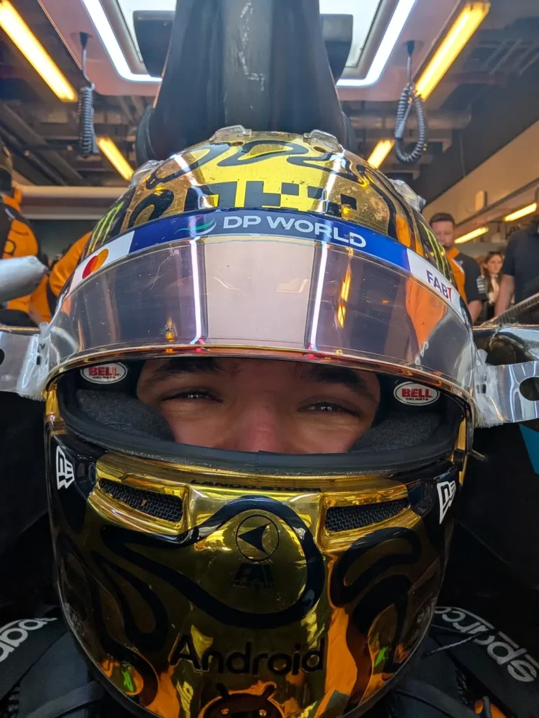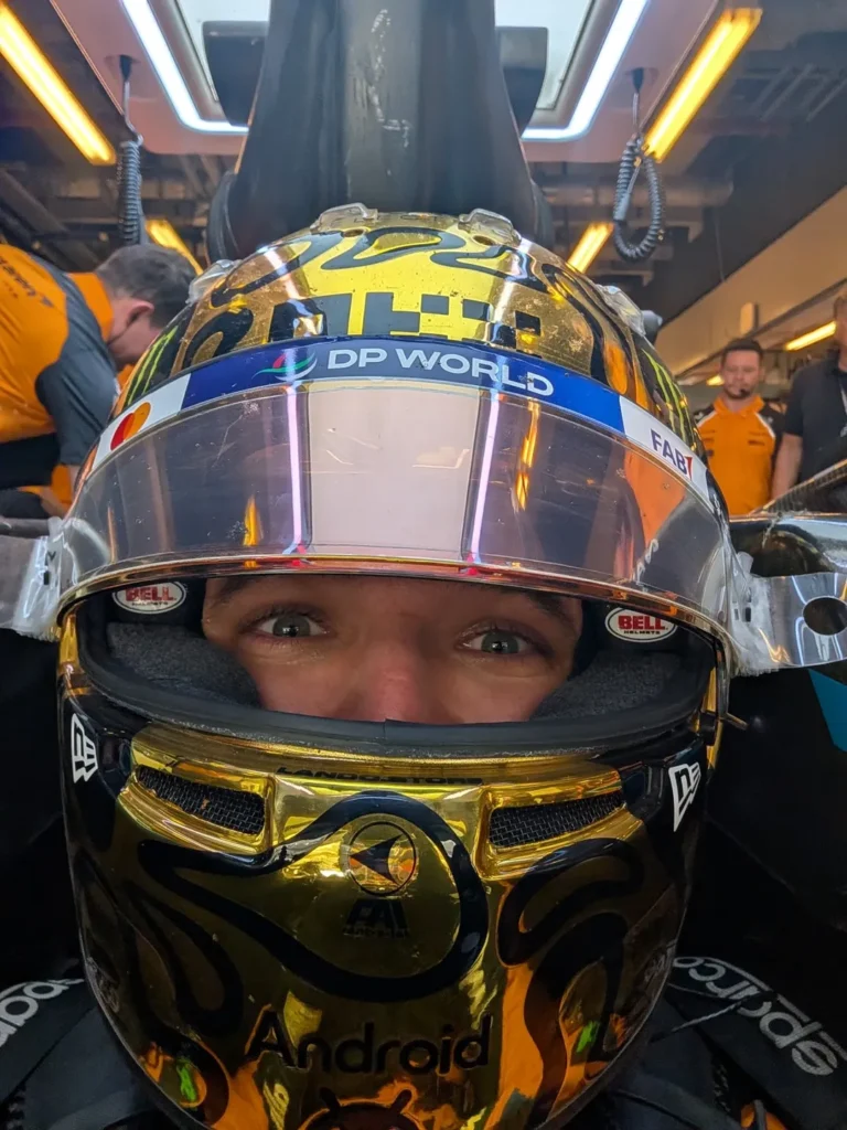 A festa pelo primeiro título da Fórmula 1 durou pouco para Lando Norris. Menos de 48 horas depois de ter se tornado campeão, o britânico voltou à pista do Circuito de Yas Marina, na terça-feira, 9, para os testes de pós-temporada com a McLaren. Norris, no entanto, fez questão de marcar a conquista e esbanjou estilo com um capacete especial para a ocasião. O novo casco manteve o mesmo design usado por ele ao longo da temporada, mas mudou do verde ou amarelo neon para o dourado.